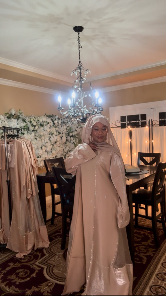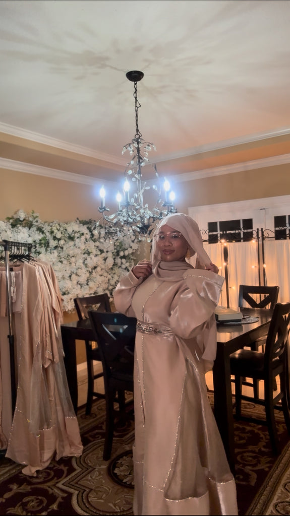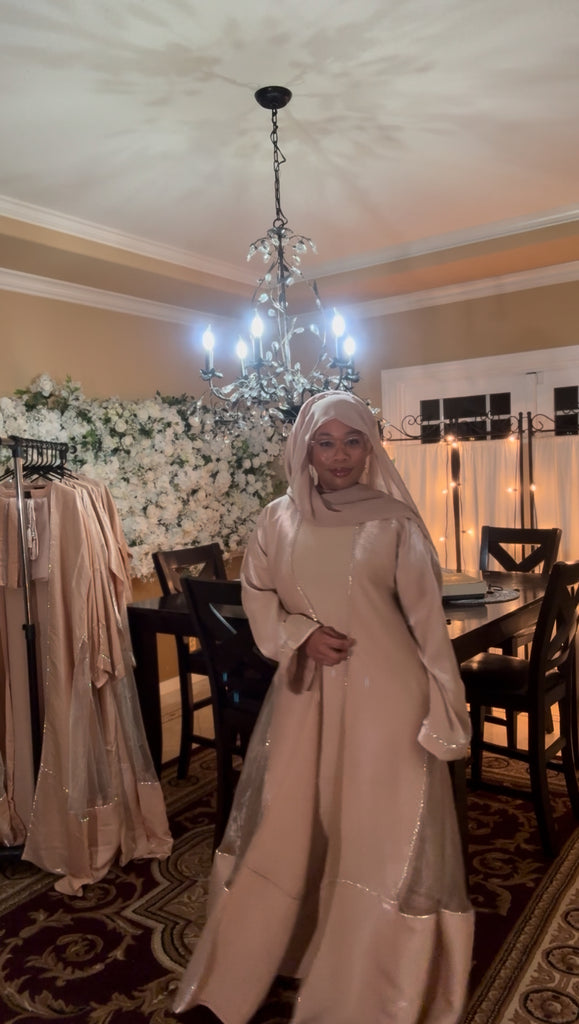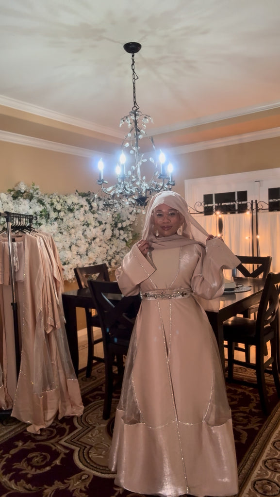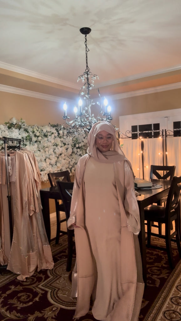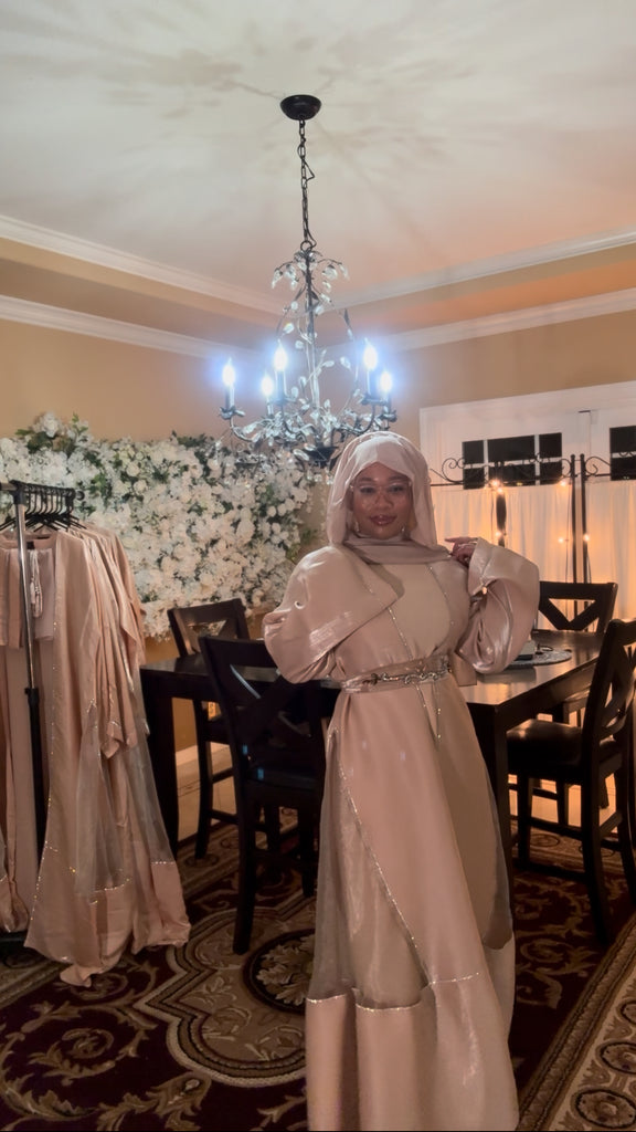 Beautiful Elegant Flowing Shimmering Dress Set. This Light Weight Full Coverage Dress is such a Fun Addition to your Wardrobe. It Comes with 3 Pieces a…short Sleeve Inner Dress, a Long Sleeve Outer Cover (Abaya) and a Matching Scarf (Hijab). With Each Purchase there will be a Thank You Gift…2 Different Style Belts that Match the Set.
