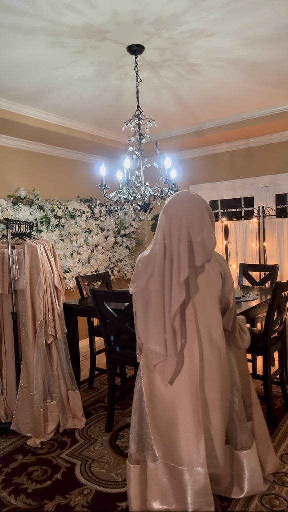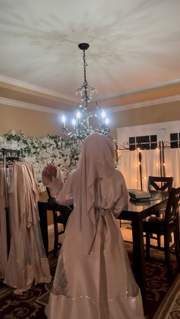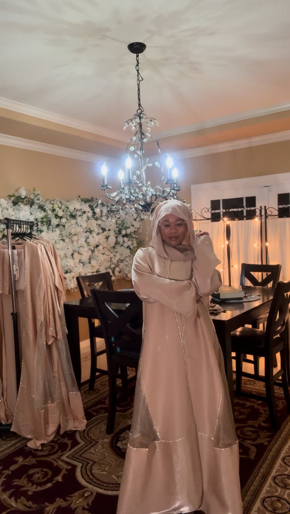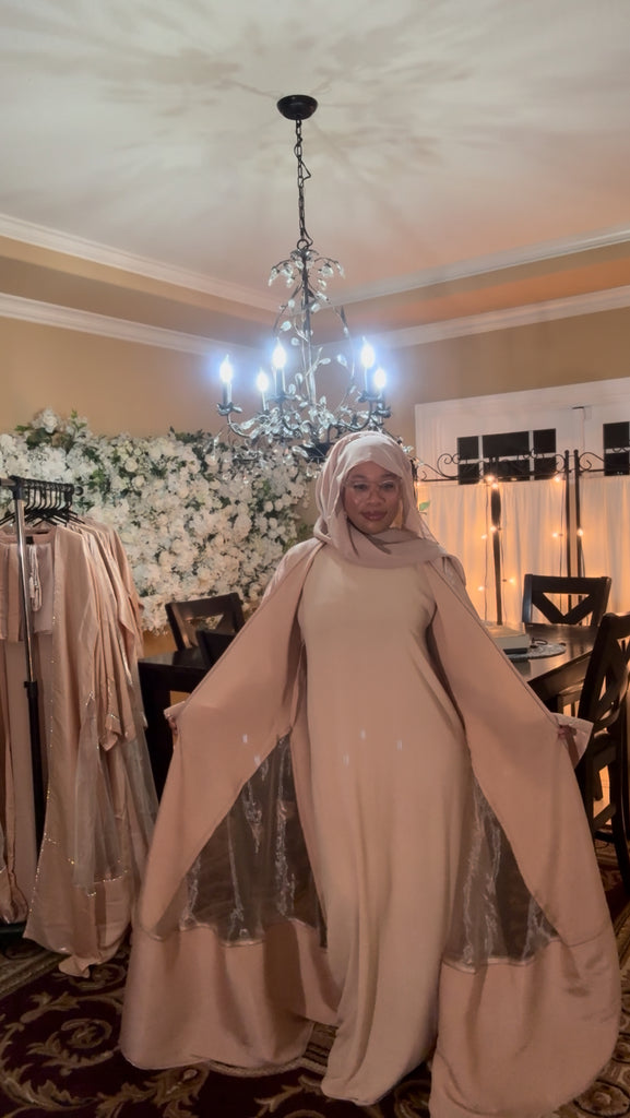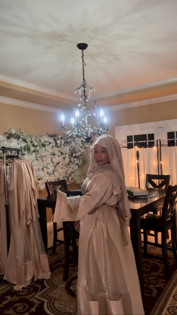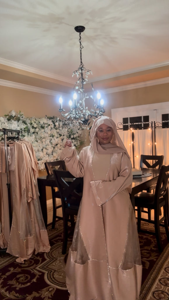 Beautiful Elegant Flowing Shimmering Dress Set. This Light Weight Full Coverage Dress is such a Fun Addition to your Wardrobe. It Comes with 3 Pieces a…short Sleeve Inner Dress, a Long Sleeve Outer Cover (Abaya) and a Matching Scarf (Hijab). With Each Purchase there will be a Thank You Gift…2 Different Style Belts that Match the Set.